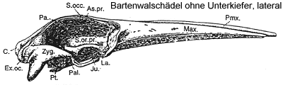Processus ascendens des Maxillare, Bo. - Basioccipitale C. - Condylus occipitalis, Ex.oc. - Exoccipitale, Fr. - Processus infraorbitalis des Maxillare, Ju. - Jugale, La. - Lacrymale, Max. - Maxillare, Na. - Nasale, Pa. - Parietale, Pal. - Palatinum, Pmx. - Praemaxillare, Prs. - Praesphenoid, Pt. - Pterygoid, S.oc. - Supraoccipitale, S.or.pr. - Processus supraorbitalis des Frontale, Sq. - Squamosum Vo. - Vomer, Zyg. - Processus zygomaticus des Squamosum. Nach KELLOGG 1928. |