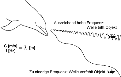 Delphine benutzen mitunter sehr hohe Frequenzen (200 kHz und mehr) um eine feine Auflösung zu erreichen. So zum Beispiel die fast blinden Flußdelphine, die auf ein gut funktionierendes Sonar angewiesen sind um ihre Beute im trüben Flußwasser des Amazonas, des Ganges oder des Yang Tze zu finden. Mit ihren bis zu 260 kHz Abtastfrequenz erkennen sie noch auf mehrere Meter Entfernung Objekte von 5,7 mm Größe. |