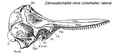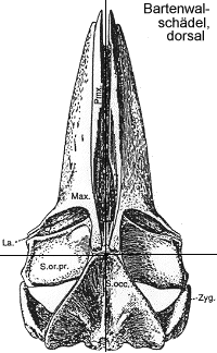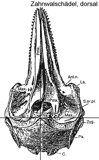Processus ascendens des Maxillare, Bo. - Basioccipitale C. - Condylus occipitalis, Ex.oc. - Exoccipitale, Fr. - Processus infraorbitalis des Maxillare, Ju. - Jugale, La. - Lacrymale, Max. - Maxillare, Na. - Nasale, Pa. - Parietale, Pal. - Palatinum, Pmx. - Praemaxillare, Prs. - Praesphenoid, Pt. - Pterygoid, S.oc. - Supraoccipitale, S.or.pr. - Processus supraorbitalis des Frontale, Sq. - Squamosum Vo. - Vomer, Zyg. - Processus zygomaticus des Squamosum. Nach KELLOGG 1928. |