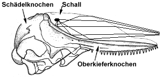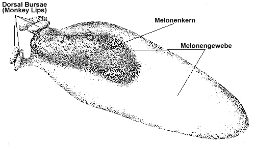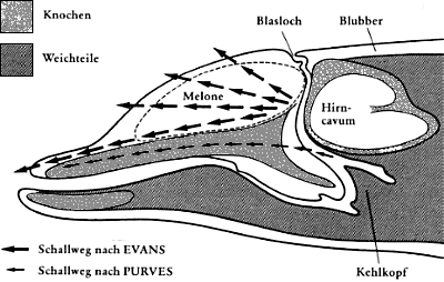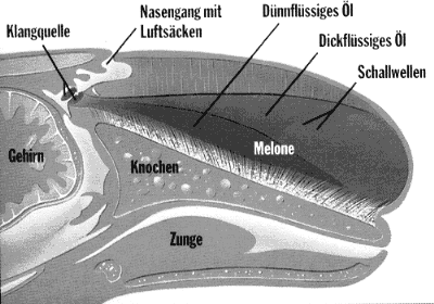 Sonartöne, welche im Delphinschädel entstehen werden hauptsächlich durch die knöchernen Strukturen des Kiefers und die verschiedenen Luftsäcke ins Wasser projiziert.