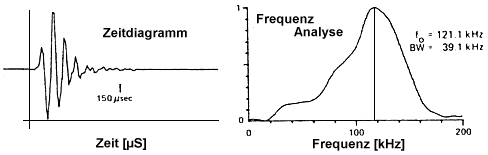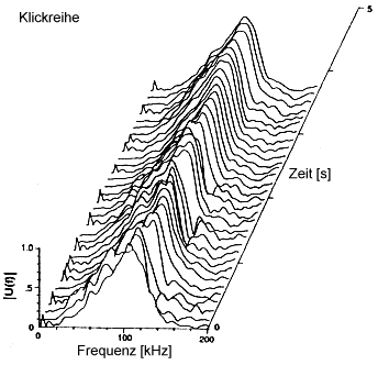 a) KlicksDie Hauptenergie wird je nach Spezies und Situation mit Spitzenfrequenzen zwischen 30 und 135 kHz bei Schalldruckspitzenwerten von bis zu 230 dB re 1µP emmitiert. Die Klickdauer liegt im Durchschnitt bei ca. 150 µSek. Die Klicks werden breitbandig gesendet, das heißt, daß im Gegensatz zu Reintönen ein Frequenzgemisch (ähnlich einem Rauschen) kurzzeitig und mit hoher Energie erzeugt wird.