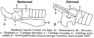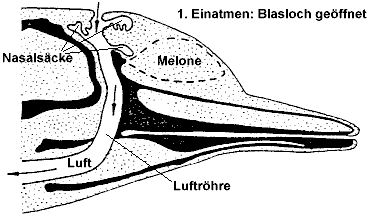 Der Kehlkopf befindet sich am Ende des Nasengangs. Zwischen ihm und der Lunge liegt noch ein Luftsack. Luft kommt bei geschloßenem Blasloch von der Lunge und passiert zuerst den Luftsack und dann den Kehlkopf. Von da gelangt die Luft in das Nasalsacksystem im oberen Nasengang. Die Luft wird dann aus den Nasalsäcken wieder zurück durch den Kehlkopf in Richtung Lunge gepumpt. So könnte die Luft mehrmals hin und her gepresst werden und dabei immer wieder den Kehlkopf durchstömen.