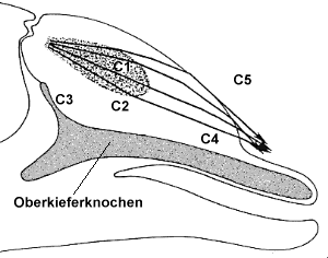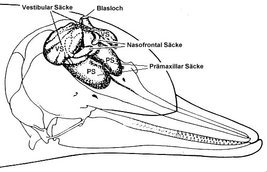 Die Vestibular Säcke reflektieren die nach oben gerichteten Schallanteile, der Schädelknochen und die Nasalpassage reflektieren rückwärts gerichtete Schallanteile und die Prämaxillar Säcke sowie der Oberkiefer die nach unten gerichteten Anteile.