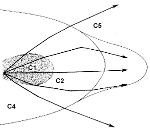 Die Vorstellung der Melonenfunktion als akustische Linse wird grob gezeigt duch die Verwendung von Strahlenzeichnungen aufgrund des "Snell-Gesetzes". Dazu unterteilen wir die Melone in vier Bereiche mit als konstant angenommener Schallgeschwindigkeit(C1-C4). |