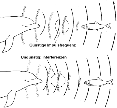 Delphine benutzen mitunter sehr hohe Frequenzen (200 kHz und mehr) um eine feine Auflösung zu erreichen. So zum Beispiel die fast blinden Flußdelphine, die auf ein gut funktionierendes Sonar angewiesen sind um ihre Beute im trüben Flußwasser des Amazonas, des Ganges oder des Yang Tze zu finden. Mit ihren bis zu 260 kHz Abtastfrequenz erkennen sie noch auf mehrere Meter Entfernung Objekte von 5,7 mm Größe. |